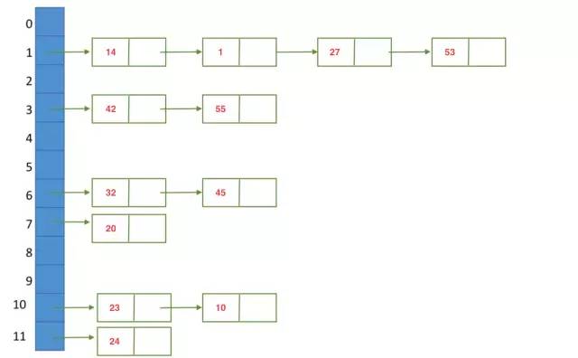 简单来说就是 数组 + 链表 。将键通过hash函数映射为大小为M的数组的下标索引,数组的每一个元素指向一个链表,链表中的每一个结点存储着hash出来的索引值为结点下标的键值对。