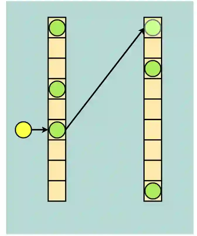 用于哈希冲突的布谷鸟哈希:黄色数据驱逐绿色数据,绿色数据在第二地址空间找到了新家(在次要空间顶部索引的淡绿色圆点)。