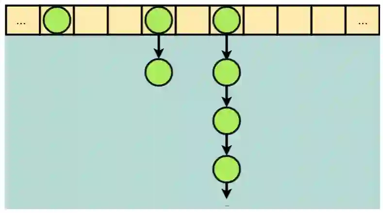 链接简单易用,我们不是在哈希表的每个索引处存储每个条目,而是存储链表的头部指针。当一个条目通过我们的哈希函数与一个已经填充的索引相冲突时,我们将它添加为链表中的最后一个元素。查找不再是严格的「常数项时间」,因为我们必须遍历链表来查找特定项目。如果我们的哈希函数存在很多冲突,我们将会有很长的链。此外,由于对于长链的查找,哈希表的性能会随着时间的推移而降低。