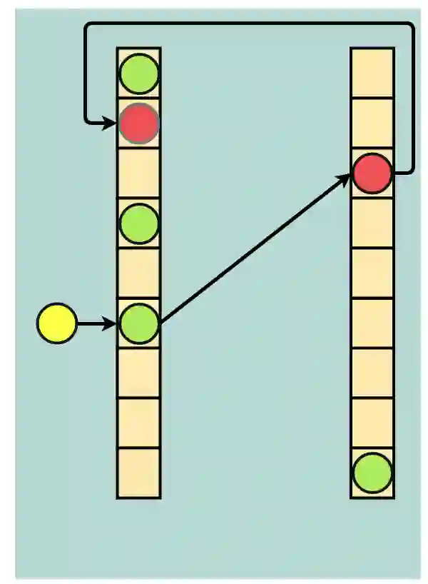二次驱逐(Double eviction):传入的黄色圆点驱逐了绿色的,绿色的驱逐红色的,红色圆点在主地址空间找到了归宿(淡红色圆点)。