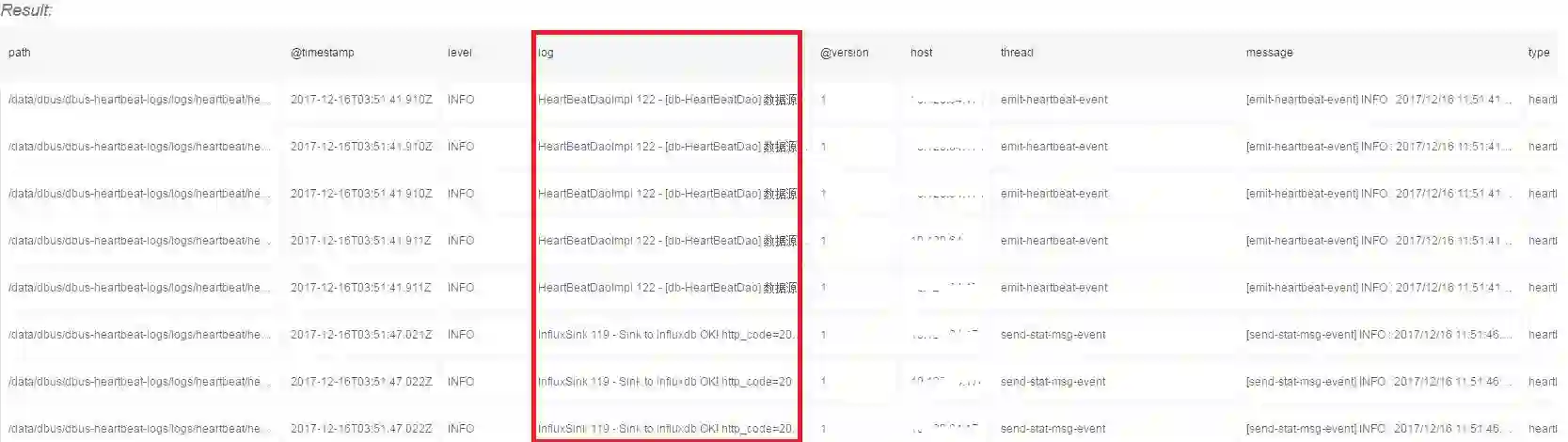 可以看到由Logstash 预先提取已经包含了log4j的基本信息,例如path、@timestamp、level等。但是数据日志的详细信息在字段log中。由于不同的数据日志输出是不一样的,因此可以看到log列数据是同的。