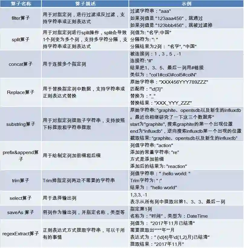 我们试图使得算子尽量满足正交性或易用性(虽然正则表达式很强大,但我们仍然开发一些简单算子例如trim算子来完成简单功能,以满足易用性),算子的开发也可以随意扩充,比如可以开发提取JSON节点值或XML节点值的算子。算子的开发也很容易,只要遵循基本接口原则,就可以开发任意自定义算子。