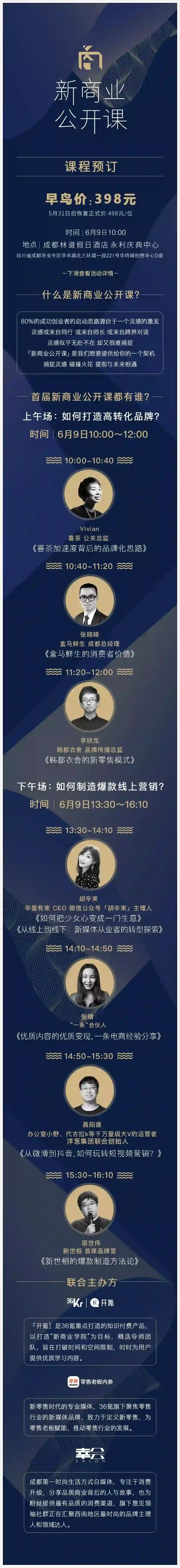 现在,这些困惑以及问题都将在36氪开氪携手成都第一时尚生活方式自媒体幸会salon、零售老板内参共同呈现的[新商业公开课]上,由流行背后的制造者们亲自揭晓!