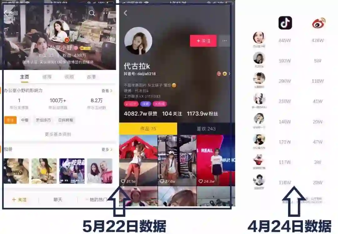 ▲在不到一个月的时间中,洋葱视频在微博和抖音两大平台中的内容关注度保持着疯狂涨势,甚至抖音第一大号“代古拉k”的粉丝数直接较之前来了一个翻倍。