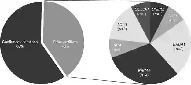 在此次研究中,基因诊断公司 Ambry Genetics 的研究人员重新分析了 49 例 DTC 的原始数据,并与临床试验数据进行比对。结果发现,只有 60% 的致病突变为真实的,其余 40% 为假阳性,其中绝大多数都是与癌症相关的基因。除此之外,一些被认定为“高危突变”的基因也被重新认定为良性的“常见突变”。