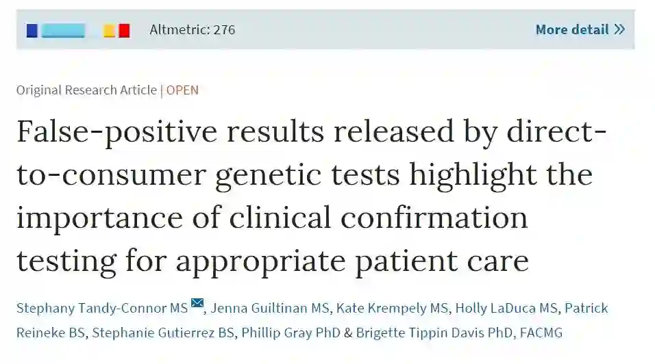 该文章的第一作者、Ambry遗传咨询师Stephany Leigh Tandy-Connor在一份声明中表示,在这项特定研究中,假阳性率如此之高是出乎他们意料的,这也让他们对现今DTC基因检测的准确性感到担忧。
