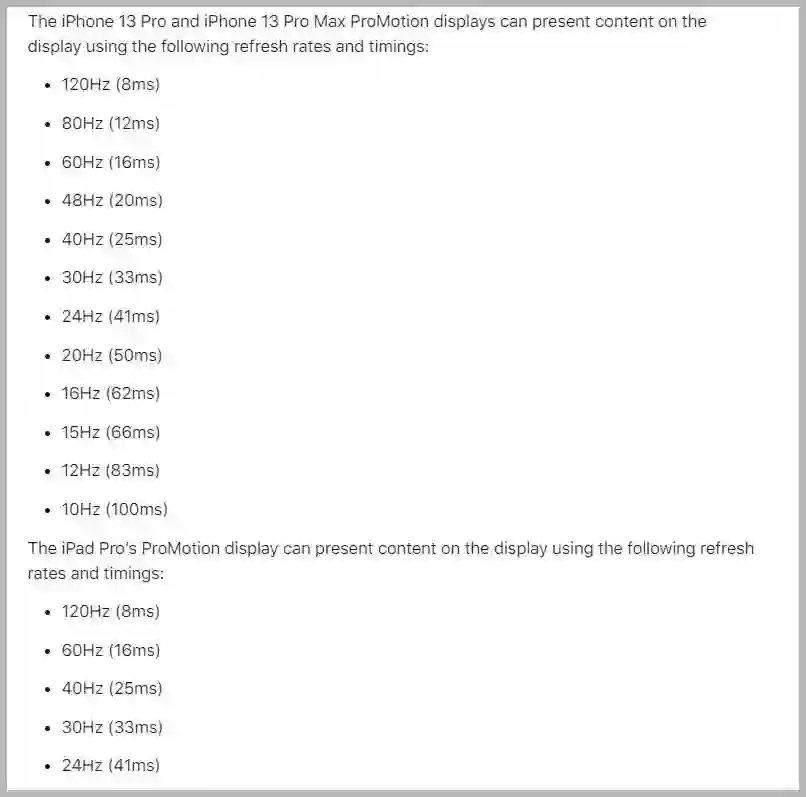 苹果将该技术称为“ProMotion 自适应刷新率技术”。根据苹果的开发者指南,iPhone 13 Pro、Pro Max 支持多达 12 档刷新率:10Hz、12Hz、15Hz、16Hz、20Hz、24Hz、30Hz、40Hz、48Hz、60Hz、80Hz、120Hz。