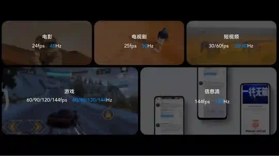 首先解释一下高刷屏的概念。高刷屏一般指支持 60Hz 以上刷新率的屏幕,即屏幕每秒刷新的频率大于 60 次。在电脑显示器领域应用已久。市场上常见的高刷屏手机,一般可以支持到最高 90Hz、120Hz、144Hz、165Hz 刷新率显示。高刷新率带来的好处是,动态画面更丝滑顺畅,能直观地提高系统流畅程度,成为消灭手机卡顿的“最后一公里路”。