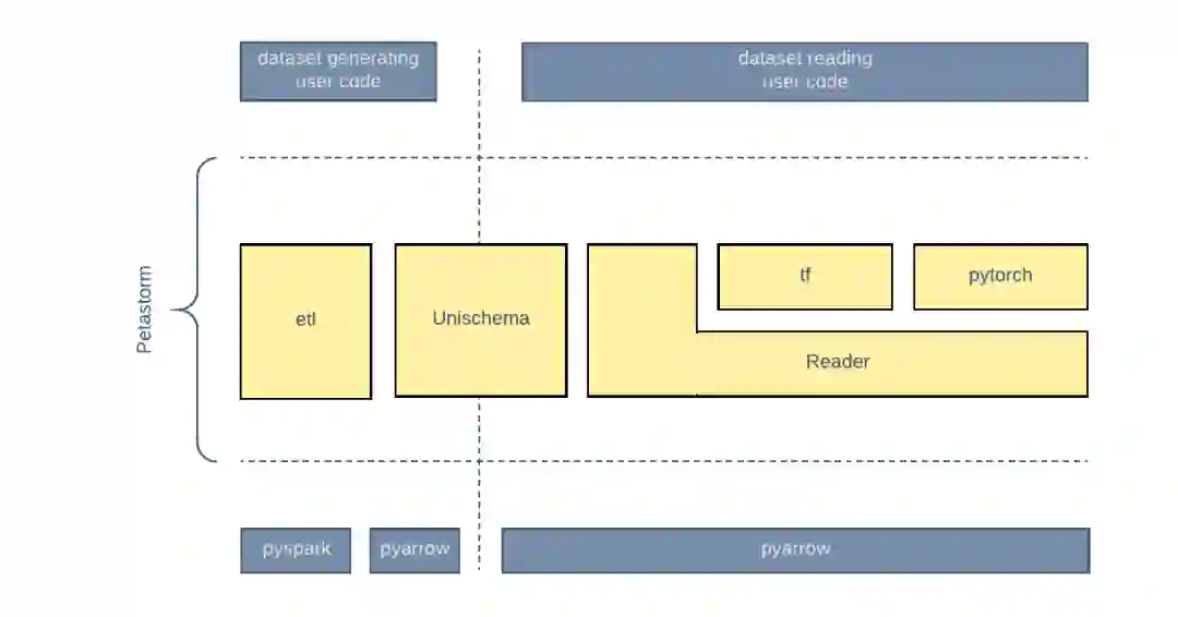 Tensorflow 和 Pytorch 是深度学习社区常用的框架。这些框架本身并不支持 Parquet 存储访问,因此我们构建了 Petastorm 来填补这一空白。