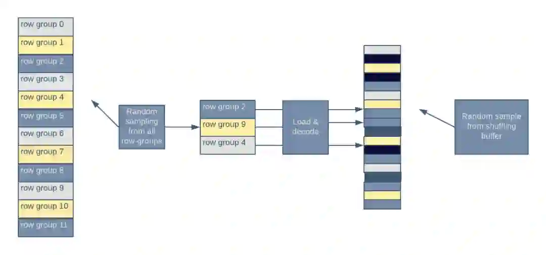 图 4:通过随机选择要加载的行组,然后将个体样本放入内存 shuffle 缓冲区来实现 shuffle。