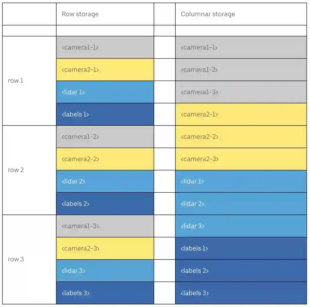 以列式顺序存储数据允许用户只加载列的子集,从而减少通过网络传输的数据量。对于收集来自自动驾驶车辆传感器的数据来说,这种好处是显而易见的:试想一下,如果你的实验只需要来自某个摄像头的图像,那么就可以从同一行的 10 张高分辨率图像中加载其中的一张。