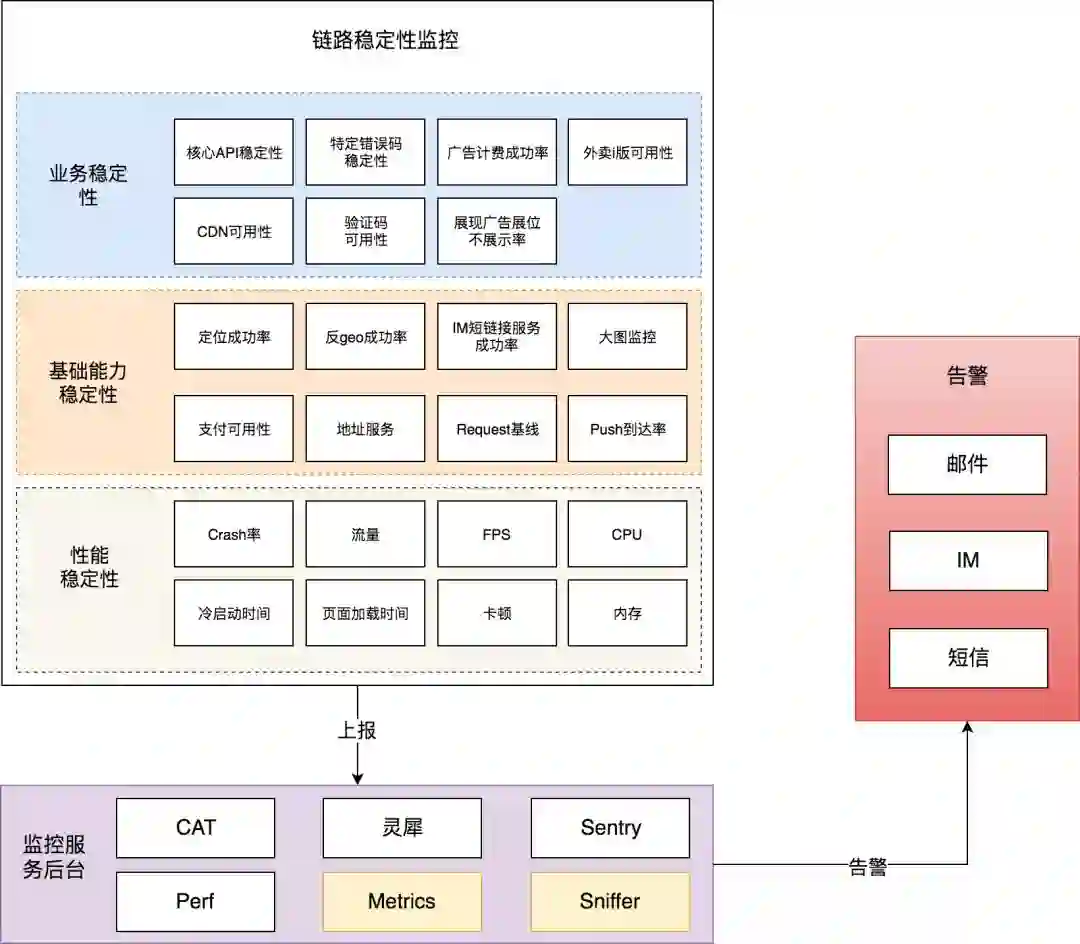这是美团外卖客户端整体质量体系全景图。整体思路:监控报警,日志体系,容灾。