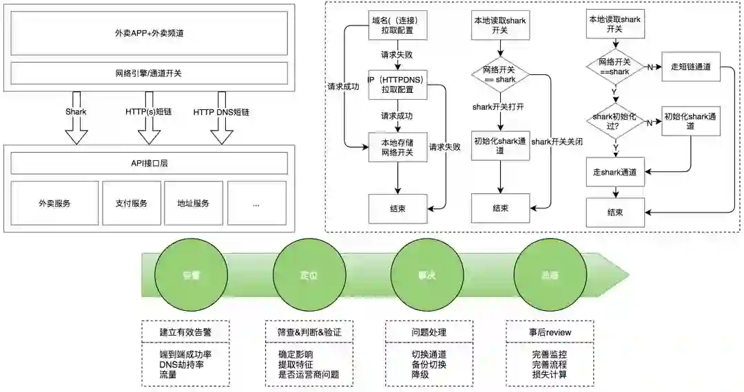 这是美团外卖多网络通道备份示意图。美团外卖客户端拥有Shark、HTTP、HTTPS、HTTP DNS等四条网络通道:整体网络以Shark长连通道为主通道,其余三条通道作为备份通道。配合完备的开关切换流程,可以在网络指标发生骤降时,实现分钟级别的分城市网络通道切换。而通过制定故障应急SOP并不断演练,提升了我们解决问题的能力和速度,有效应对各类网络异常。我们的网络通道开关思路也输出至集团其他部门,有效支持了业务发展。