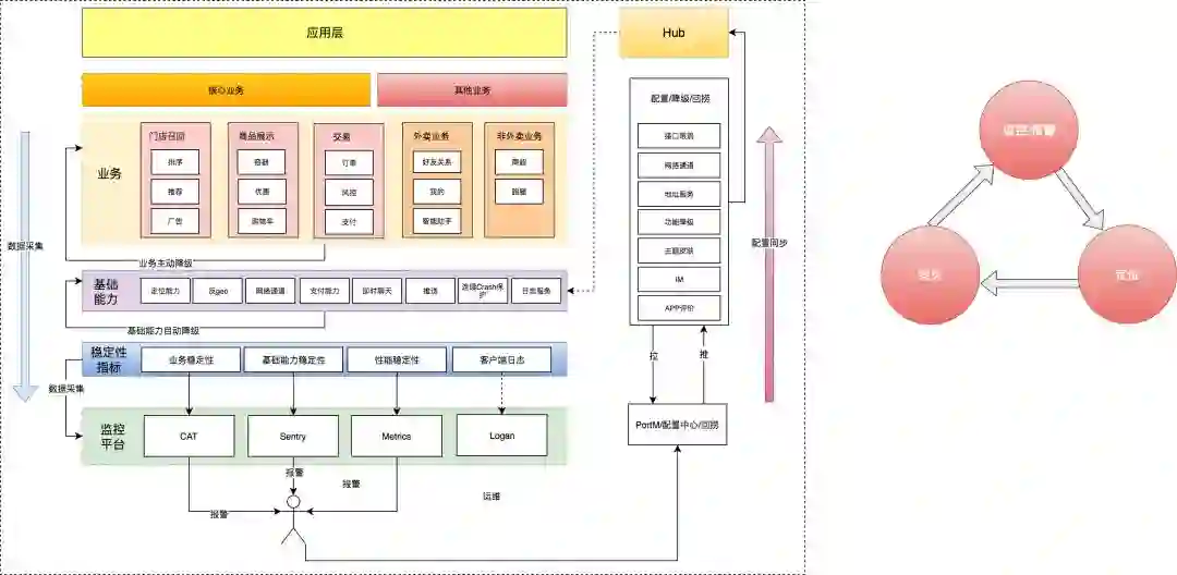 右边则是美团外卖客户端业务/技术降级开关流程图。通过推拉结合,缓存更新策略,我们能够分钟级别同步降级配置,快速止损。