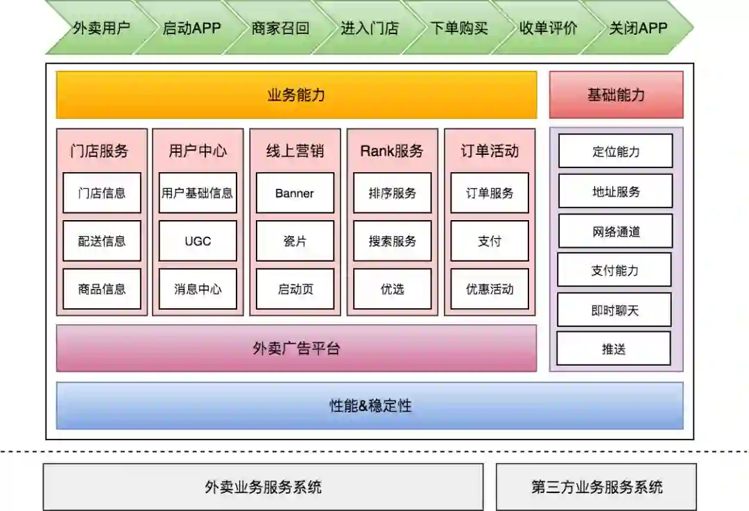 这是美团外卖整体的业务架构,整体上以商品交易链路(门店召回,商品展示,交易)为核心方向进行建设,局部上依据业务特点和团队分工分成多个可独立运维单元单独维护。可独立运维单元的简单性是可靠性的前提条件,这使得我们能够持续关注功能迭代,不断完成相关的工程开发任务。