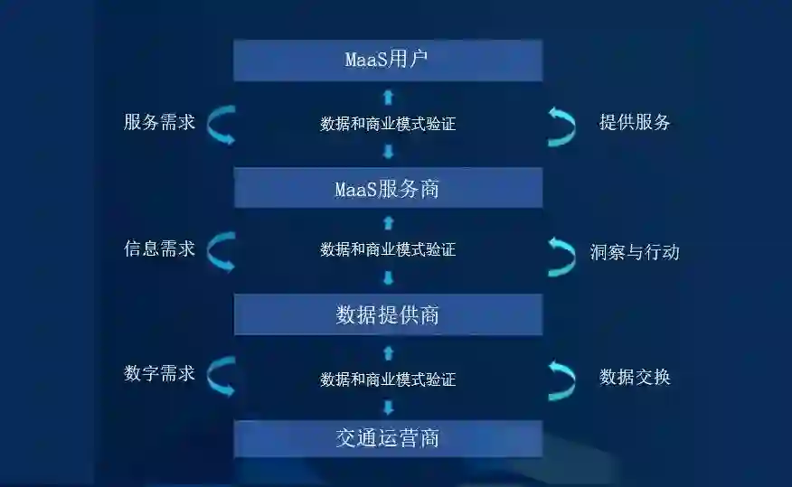 还要有MaaS服务提供商和用户的积极参与,MaaS服务商负责平台的开发和运营,开发一个可以在各种智能设备上使用的统一服务入口,可以是APP或微信公众号或小程序,以简单直观的方式让用户进行预约、支付以及享受个性化的信息服务。平台还包括强大的后台功能,主要包括路径规划系统、出行需求管理系统、多模式多层次的交通运输系统、一个高覆盖率的MAAS站场系统、一次支付和多通路的结算系统以及运行大数据系统,大数据主要包括天气、道路、服务区、便利店、车站、线路、停车场、地图等静态数据,有各个交通子系统比如海陆空运行的实时数据,有客户的出行需求数据,有支付和结算的财务数据,有预测数据等。