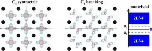图1,二维系统中的零维表面态。左,黑点代表原子位置,花瓣状的轨道代表占据态Wannier函数。中,四度旋转对称性被破坏,Wannier函数可以劈裂为两组。右侧是零维表面态的能级图。