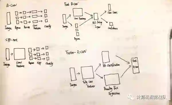 我就自己画了下最近四个较流行的框架简单图(R-CNN、SPP-Net、Fast R-CNN和Faster R-CNN),如有不对地方请指正谢谢!