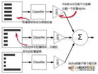 (2)Adaboost算法:这是一种迭代算法,其核心思想是针对同一个训练集训练不同的分类器(弱分类器),然后把这些弱分类器集合起来,构成一个更强的最终分类器(强分类器)。算法本身是改变数据分布实现的,它根据每次训练集之中的每个样本的分类是否正确,以及上次的总体分类的准确率,来确定每个样本的权值。将修改权值的新数据送给下层分类器进行训练,然后将每次训练得到的分类器融合起来,作为最后的决策分类器。AdaBoost算法主要解决了:两类问题、多类单标签问题、多类多标签问题、大类单标签问题和回归问题; 优点:学习精度明显增加,并且不会出现过拟合问题,AdaBoost算法技术常用于人脸识别和目标跟踪领域。