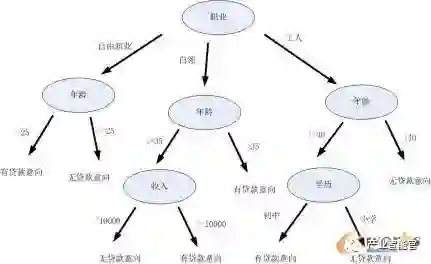 (1)决策树(Decision Trees):决策树可看作一个树状预测模型,它通过把实例从根节点排列到某个叶子节点来分类实例,叶子节点即为实例所属的分类。决策树的核心问题是选择分裂属性和决策树的剪枝。决策树是一个决策支持工具,它用树形的图或者模型表示决策及其可能的后果,包括随机事件的影响、资源消耗、以及用途。用于分析判断有无贷款意向的决策树示如图 所示,从商业角度看,常用于基于规则的信用评估、赛马结果预测等。