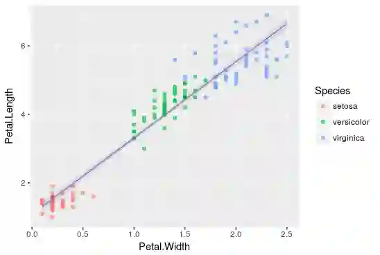 # Load required packages library(ggplot2) # Load iris dataset data(iris) # Have a look at the first 10 observations of the dataset head(iris) # Fit the regression line fitted_model <- lm(Sepal.Length ~ Petal.Width + Petal.Length, data = iris) # Get details about the parameters of the selected model summary(fitted_model) # Plot the data points along with the regression line ggplot(iris, aes(x = Petal.Width, y = Petal.Length, color = Species)) + geom_point(alpha = 6/10) + stat_smooth(method = "lm", fill="blue", colour="grey50", size=0.5, alpha = 0.1)