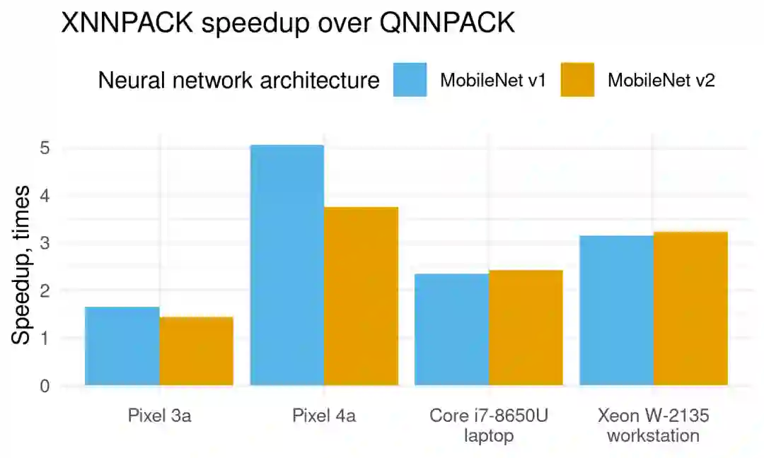 XNNPACK 起初是 QNNPACK 库的一个分支,但是由于 XNNPACK 的第一个版本专注于浮点推理,而 QNNPACK 专注于量化推理,因此无法将两者进行比较。如今,随着 XNNPACK 引入对量化推理的支持及近两年的性能优化,我们可以直接评估。