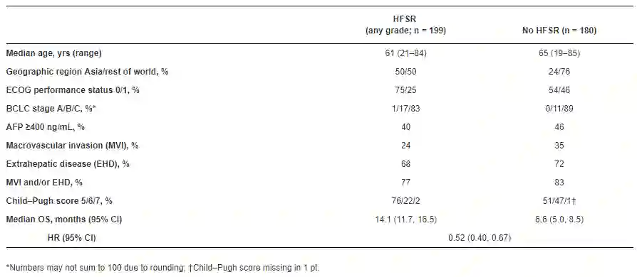 共计379例患者接受随机,其中374例患者至少接受过一个剂量的瑞戈非尼治疗,其中,53% (N= 199)的患者发生了不同程度的HFSR,13%(N = 47)的患者发生了3级HFSR。在所有发生HFSR的患者中,77% (n = 153)的患者在治疗的第一个周期便首次发生了HFSR事件,本研究纳入患者的基线特征存在一定的偏倚(表2)。如果不区分患者首次发生HFSR的时间,仅按照是否发生HFSR进行分组分析,结果发现:发生过HFSR的患者与从未发生HFSR的患者相比,mOS明显改善(14.1个月vs. 6.6个月)(表2)。在第一个治疗周期内即发生HFSR的患者与从未发生过HFSR的患者相比,OS同样获得显著延长(13.2 个月vs. 8.5个月; HR 0.66, 95% CI 0.51, 0.86)。