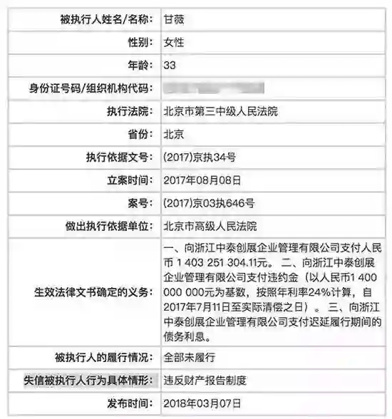 近日据北京市第三中级人民法院发布时间为2018年3月7日的执行信息显示,贾跃亭妻子甘薇应向浙江中泰创展有限公司支付人民币14.03亿元,支付按照年利率24%计算的违约金,以及迟延履行期间的债务利息,由于甘薇未能履行生效法律文书确定的义务,列入失信被执行人名单。