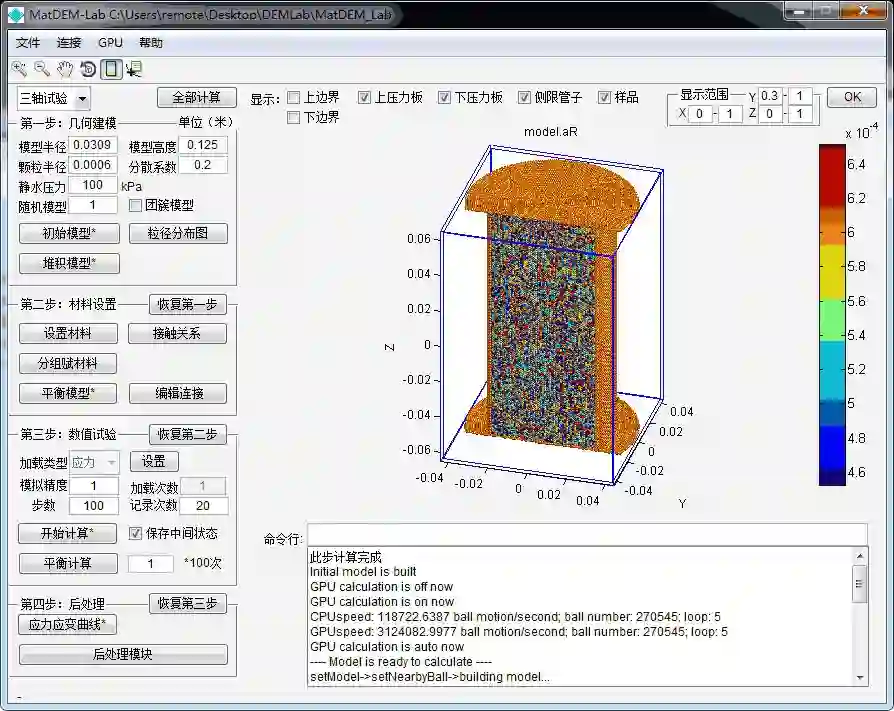 基于二次开发代码生成的MatDEM离散元实验室,可用于岩土体宏微观研究。目前已提供单轴压缩,侧限压缩,直剪,扭剪,常规三轴和真三轴等试验的数值模拟功能。右下方命令行处可见,MatDEM每秒完成310万次颗粒三维运动计算(目前最快达到2000万次)。
