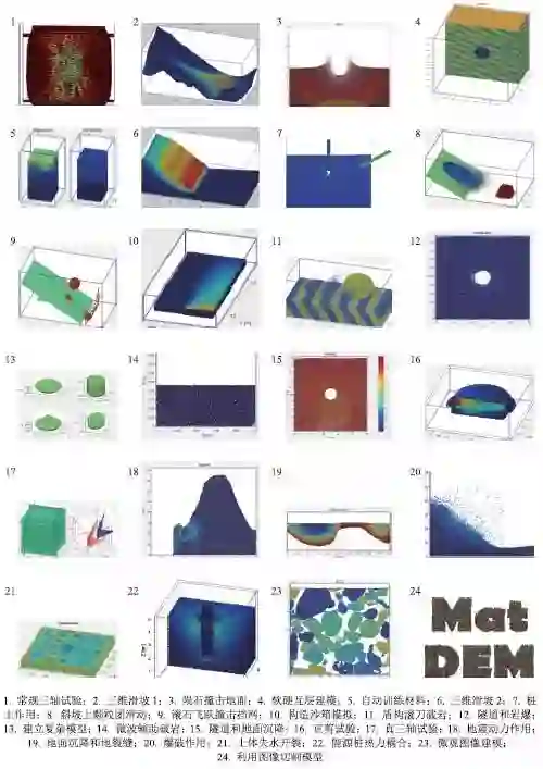 离散元法理论研究、系统研发和应用是一条非常漫长和艰辛的道路。在MatDEM 软件的开发和本书的撰写过程中,得到了很多专家学者的帮助和指导。软件公开下载一年以来,数百名专家学者和研究生参与了软件的测试和应用,不断地提高了软件的通用性、易用性和专业度。在此表示衷心的感谢!