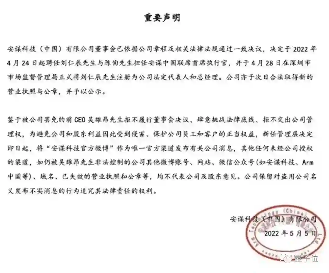 安谋科技官方今日发微博表示,已决定于2022年4月24日起聘任刘仁辰与陈恂担任安谋中国联席首席执行官,并于4月28日正式将刘仁辰注册为公司法人和总经理。