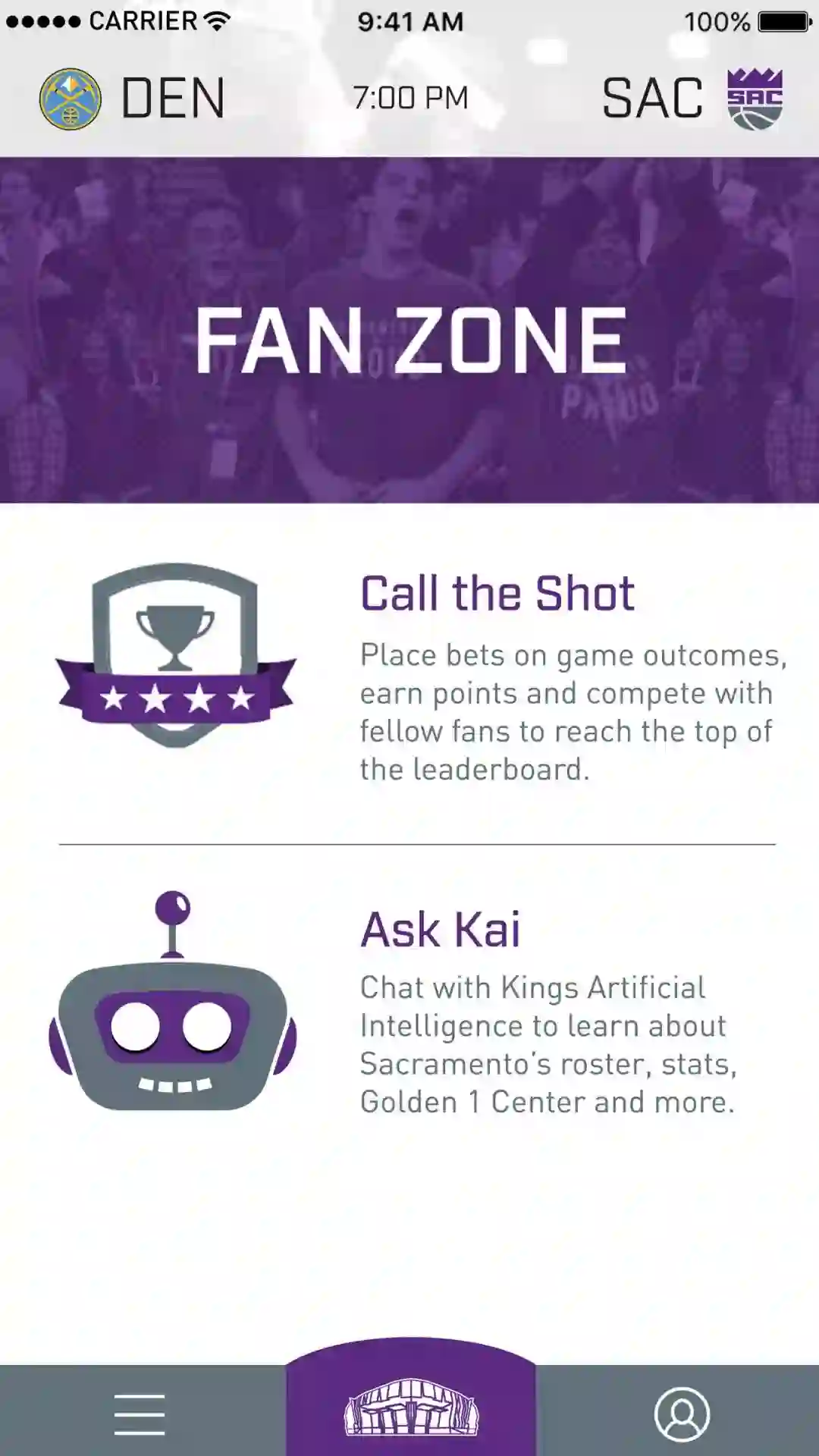 2016 年 6 月,Sacramento Kings 篮球队与定制机器人开发 Sapien 公司合作,推出了一款名为 KAI 的聊天机器人,取意于 Kings Artificial Intelligence 的首字母缩写。
