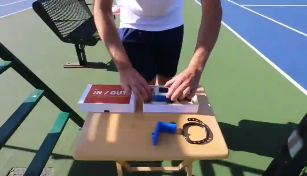 该设备使用计算机视觉来检测网球击球的速度和位置。In/Out 只有口袋般大小,需要使用时将其挂在球网边上。