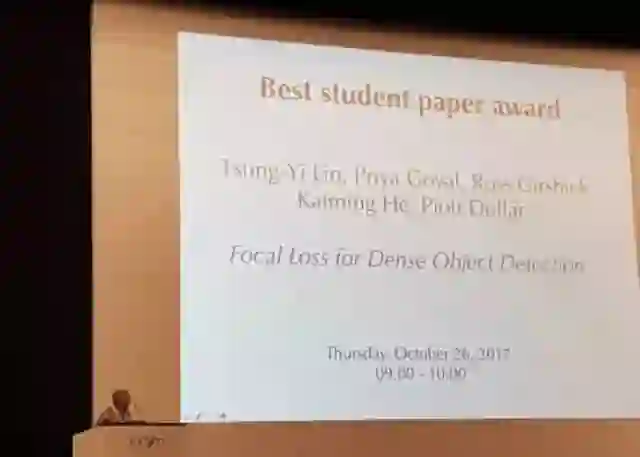此次获奖论文,Facebook人工智能实验室何恺明等人获得最佳论文和最佳学生论文奖;DeepMind CEO 哈萨比斯导师Tomaso Poggio获得终身成就奖;贾扬清率Caffe团队获“无私贡献奖”。