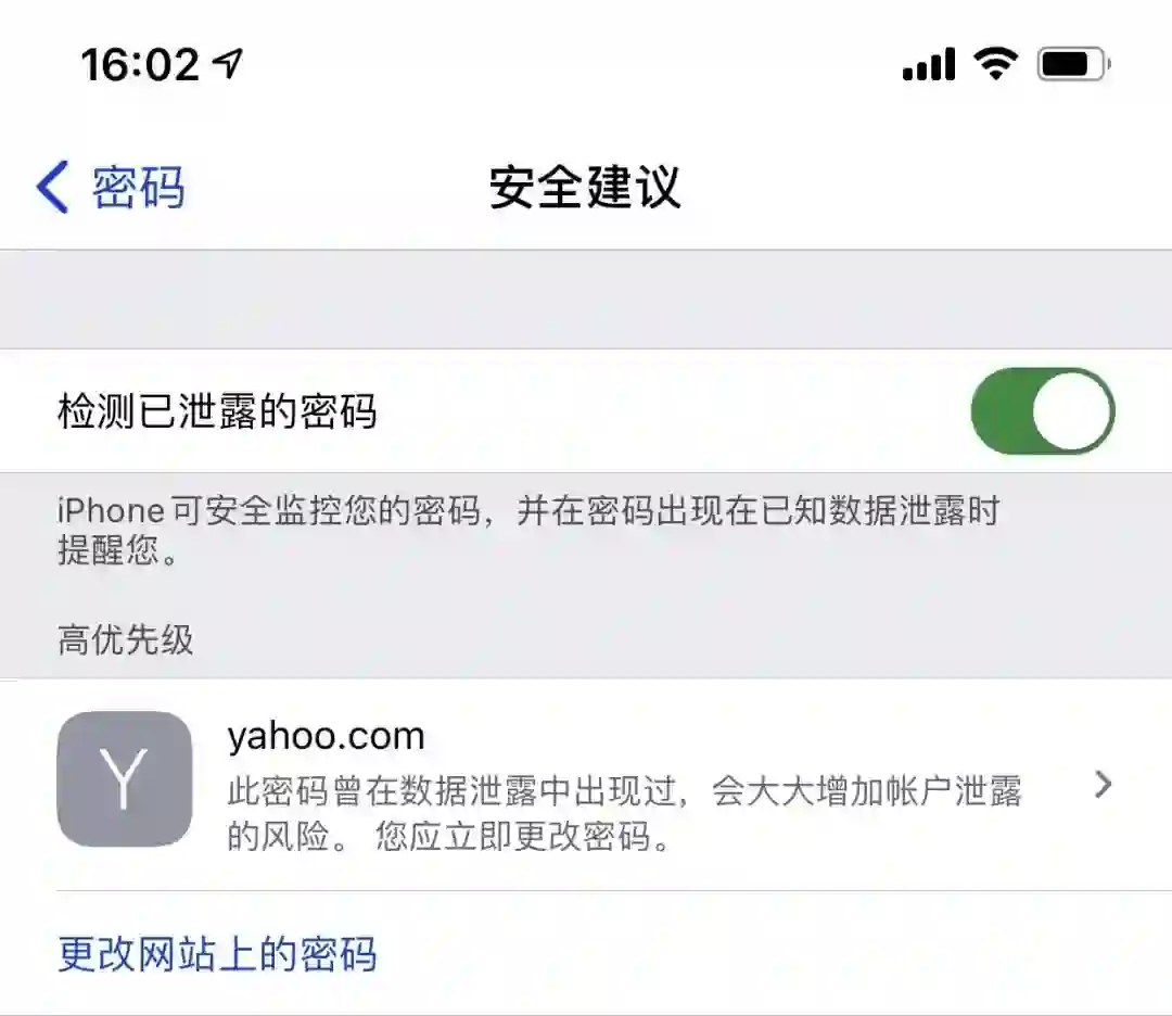 此外,iCloud 钥匙串还会自动检测密码是否泄露,并给出安全建议。