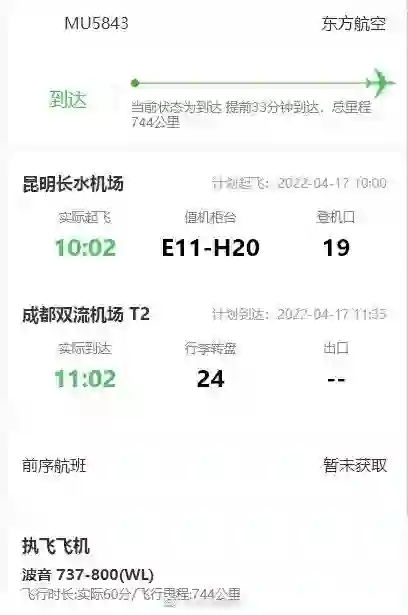 “3·21”东航MU5735航空器飞行事故发生后,中国东方航空宣布停飞旗下所有波音737-800客机。4月17日,东航恢复了波音737-800执飞航班的商业运营。复飞首趟航班为MU5843,从昆明飞往成都,搭载了170名乘客,为满员状态。东航客服表示,经过半个月的全面系统检查,东航正在严格按照民航适航的标准和规章要求,有计划地逐步恢复运营。(中新财经、极目新闻)