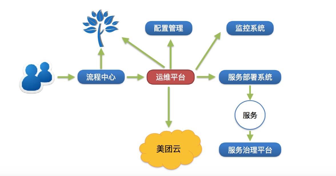 之后云平台会返回到运维平台,运维平台将创建好的机器加到流程中心提供的服务节点下,同时调用配置管理系统对机器进行环境初始化,初始化完成后会自动添加基础监控信息。之后调用部署系统,对服务进行部署。部署之后,服务根据它的服务的标签,最终注册到服务治理平台,然后就能提供线上服务了。相当于只要技术人员发起,整个流程都是能自动完成的。
