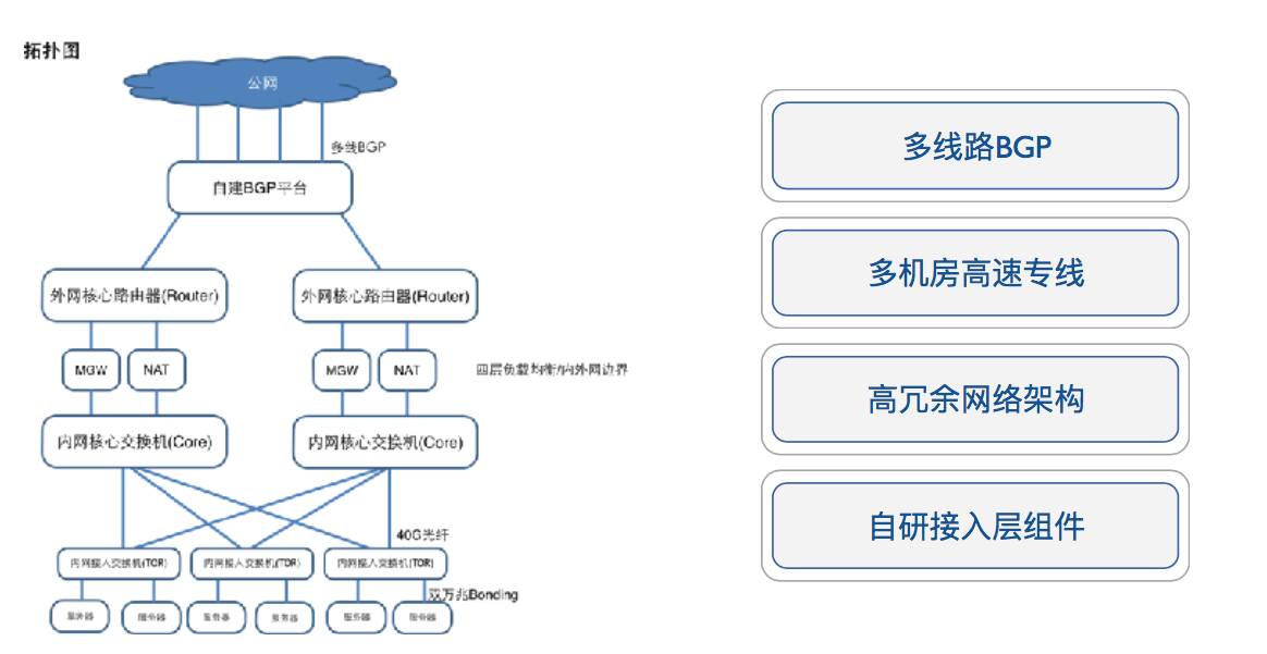 上图是我们云计算基础设施网络相关的架构图,可以看到上面是公网的入口,流量接入大部分都是走的BGP链路。往下是多机房间的高速专线,专线的稳定性经历了线上大规模业务的校验,像外卖、团购、酒旅等,都是做多机房部署的。