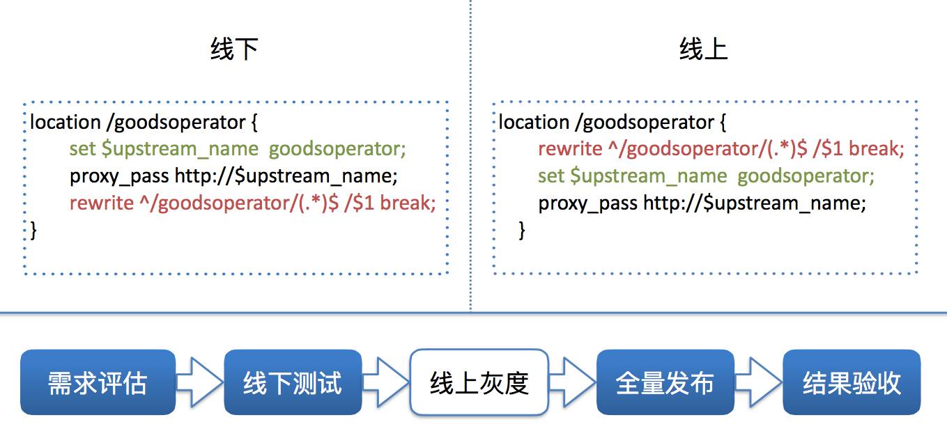 它和线上写的配置,在红色部分的顺序发生了变化,如果rewrite的指令在set指令之后,可以生效,结果符合预期。当我们把rewrite指令前置后,break指令会被先执行,会结束整个重写过程,rewrite之后的set就不执行了,导致配置上线之后,Nginx找不到后端的服务,整个线上的服务就崩溃了。如果做好充分的灰度,我们就能及时发现问题并解决,但是我们在上线的过程中缺少了灰度过程。事实上,标准的SOP(标准操作程序)应该是上图中的五步,但是负责变更的同学想当然也好,或者是粗心大意也好,在线下测试以后没有发现异常,就直接全量上线了,最终酿成大祸。