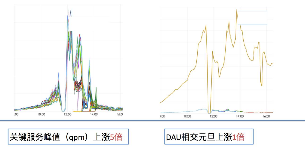 ② 容量。一些大的节假日或者秒杀抢购都会带来大流量,异常流量攻击或者爬虫抓取也会带来流量突增。如下图所示,这是猫眼发生的一次较大的事故,这个故障主要的原因是最底层的、最后端的服务容量不到位,在流量发生大的变化的时候它没撑住,关键的服务峰值上涨5倍,DAU相交元旦(前一个历史峰值)涨了一倍。