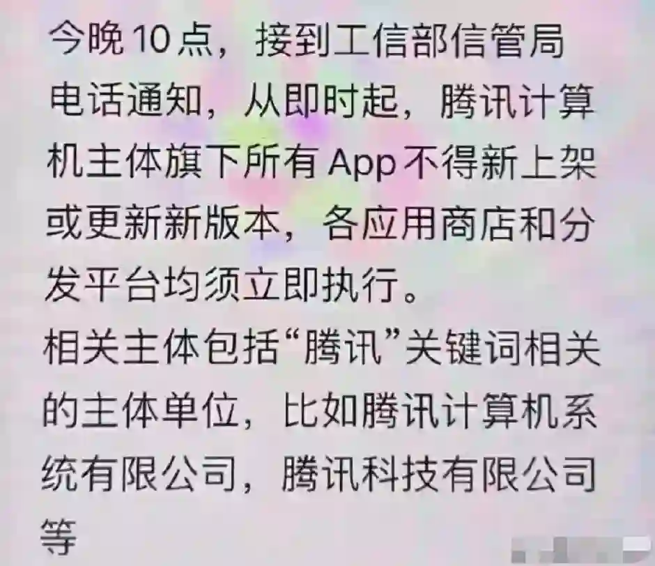 而就在近日,网传互联网巨头腾讯接到工信部信管局电话通知,要求腾讯旗下所有APP不得新上架或更新新版本,各应用商店和分发平台立即执行。