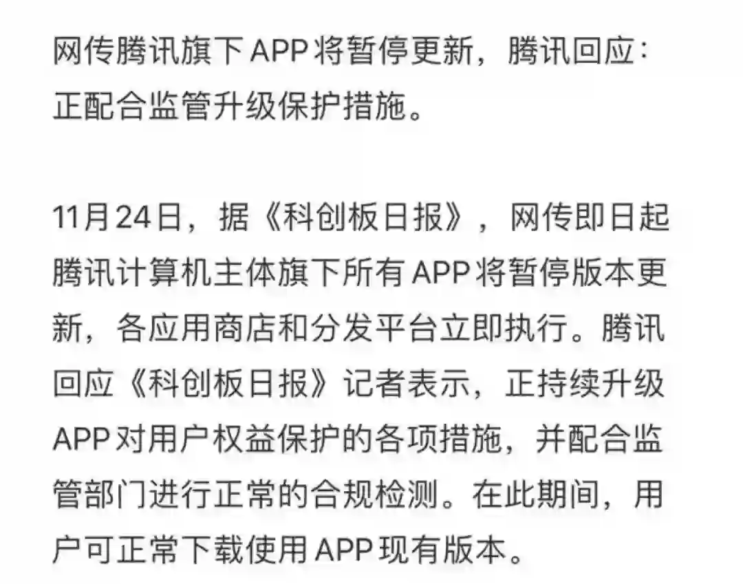 从腾讯的回应看,「腾讯旗下所有APP不得新上架或更新新版本」的消息基本属实。
