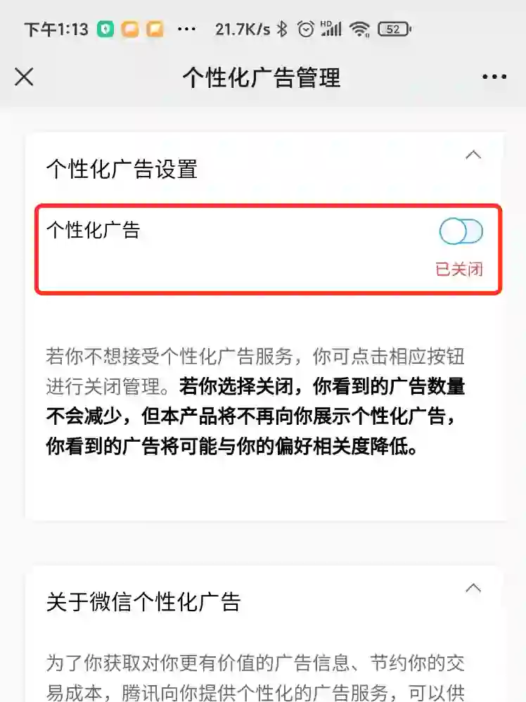 微信已在最新的8.0.16新版本中,提供了「个性化广告推荐」关闭功能。
