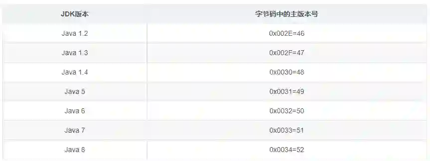 紧接着魔数之后的4个字节为Java版本信息:第5和第6个字节是次版本号(minor_version),第7和第8个字节是主版本号(major_version)。