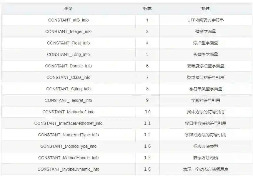 我们也可以把常量池当做一个数组(常量池中的每一项常量都是一个表),与一般数组不同的是,常量池数组中不同的元素类型,结构都是不同的,长度当然也不相同;但是每一个元素的第一个数据都是u1类型,该字节是个标志位,占一个字节。JVM在解析长量池时,会根据这个u1类型来获取元素的具体类型。目前,常量池中出现的常量类型有14种,如下表: