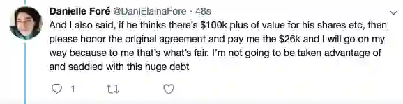 Daniel Foré 还说道,”如果 Cassidy 认为他的股份有 10 万美元以上的价值,那么请履行原来的协议,支付给我 2.6 万美元,我会离职走人。“