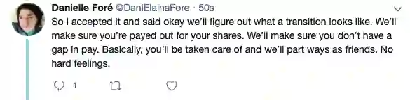 这让 Daniel Foré 感觉很糟糕,但是她也无法责怪他人不愿降薪,因此她也接受了这个现实,并对 Cassidy 说道,「我们会确保你得到你的股份应有的报酬,也不会苛刻你的工资。正常情况下,我们会像朋友一样分道扬镳,并没有什么难言之隐。」