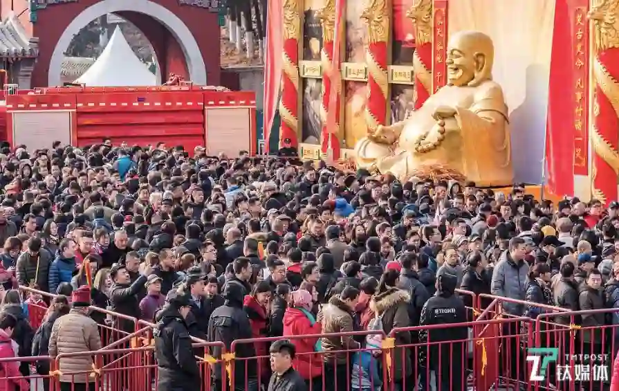 2月5日,农历大年初一,第六届北京八大处新春祈福庙会正式开门迎客。到八大处灵光寺进香的香客早早地排起了长队,二处广场香客爆棚。