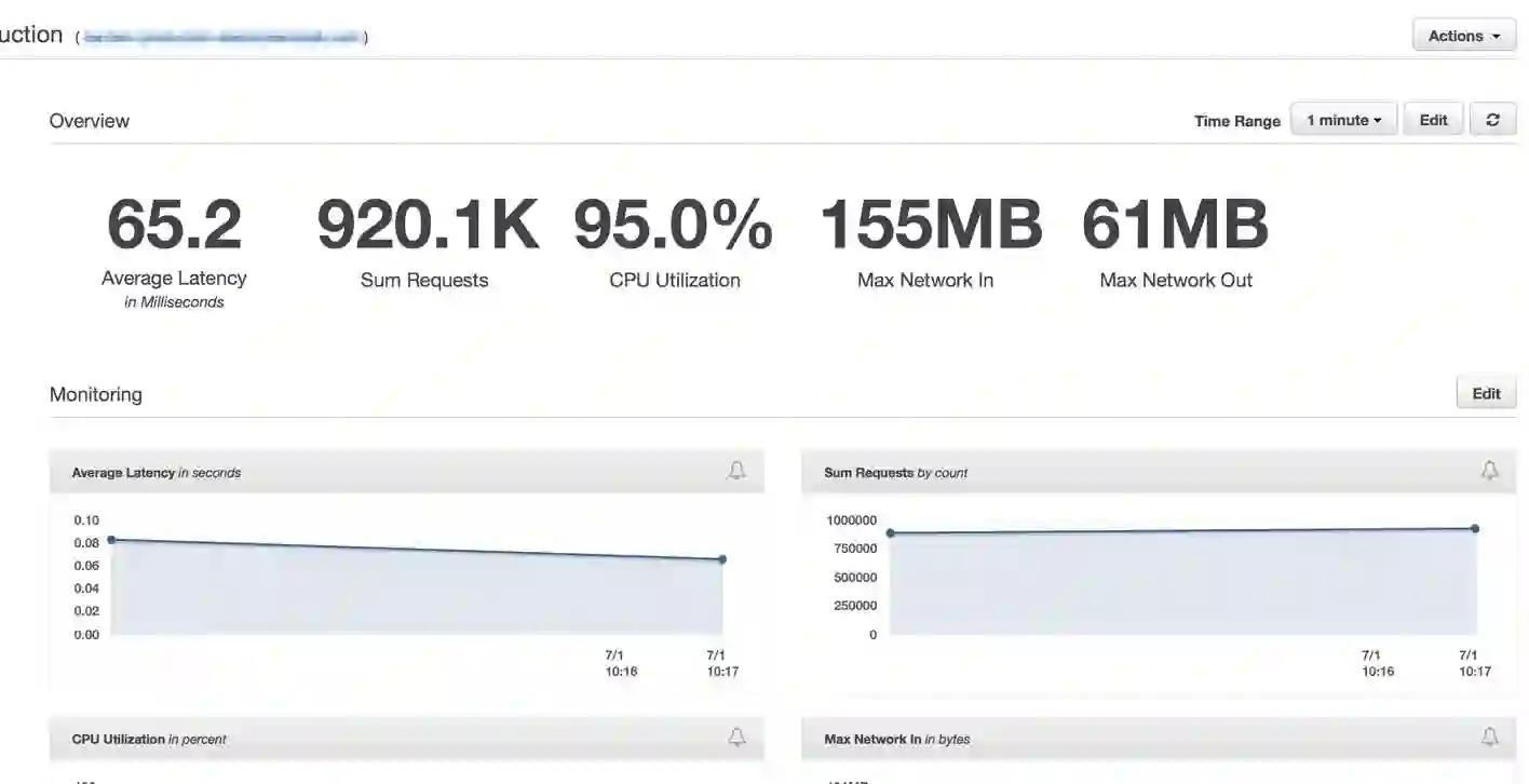 弹性负载均衡完全预热几分钟后,我们看到ElasticBeanstalk应用服务每分钟逼近100万个请求。通常在早晨的几个小时里,流量高峰会超过每分钟100万个请求。