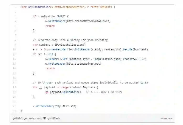 首先通过创建一些structure,定义通过POST调用来接收到的web请求负载,还有一个上传请求负载到S3 bucket的函数。